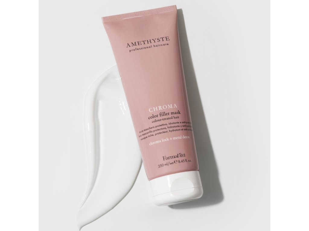 Amethyste Chroma Color Filler Mask je intenzivní, bohatá maska, která cíleně bojuje proti vyblednutí barvy a poškození vlasového vlákna. Její unikátní složení proniká hluboko do struktury vlasu, kde ho hydratuje, zaceluje a redukuje nežádoucí poréznost. Výsledkem je hedvábně jemná, poddajná a zářivě lesklá hříva s dlouhotrvajícím a sytým barevným odstínem.